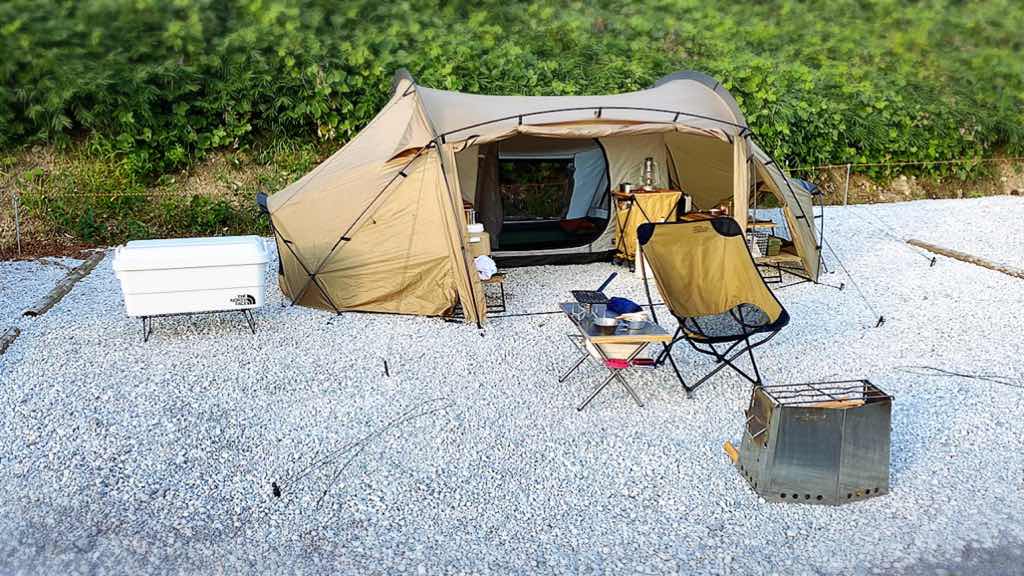 設営完了しました。横幅、奥行き共にかなり余裕があります。自立式のテント広さ的には十分です。タープを張るならちょっと工夫が必要かもですね・・・