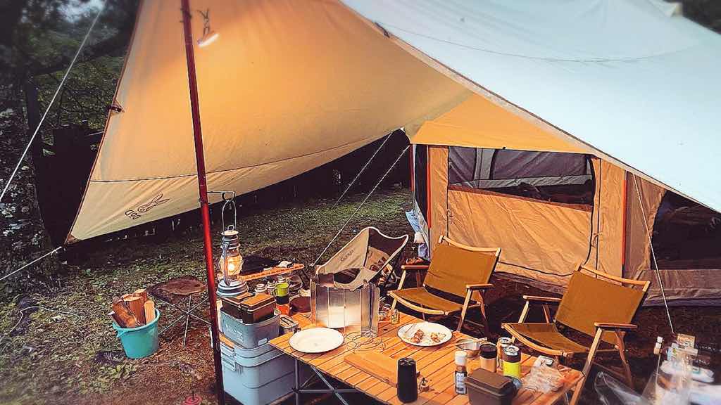 我が家はタケノコテントという縦横4.5mのティピーテントにチーズタープという縦横5mのタープを使っています。